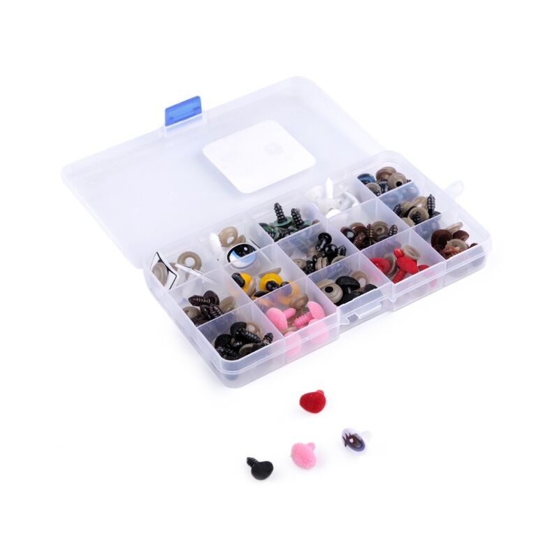 Set ochi și nas pentru animale de pluș. Setul conține 15 modele de ochi și nasuri pe jucării cu element de siguranță, cca. 75buc. Material: plastic, Dimensiuni cutie: 10x17,5x 2,5cm. Prețul se referă la o cutie.