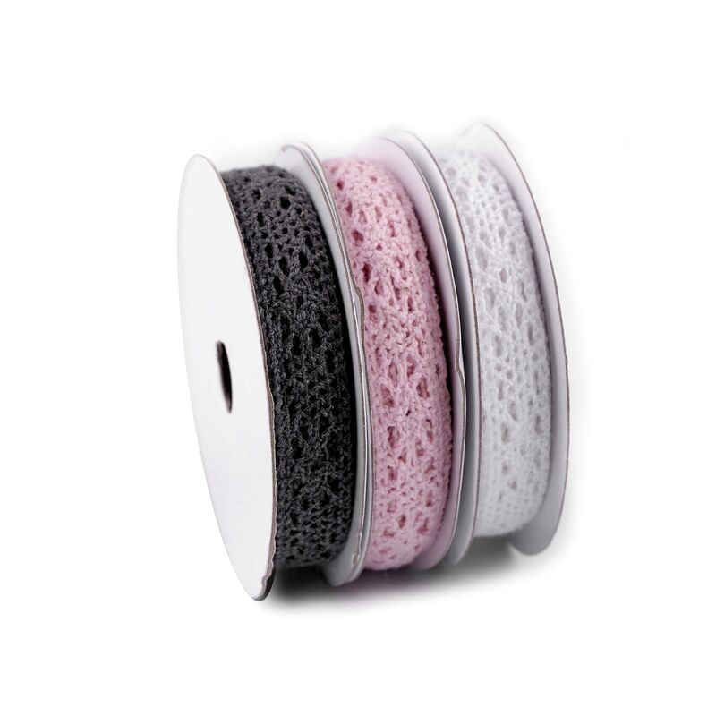 Într-un set sunt trei bobine și fiecare dintre ele are o înfășurare de 5m. Prin urmare, un set conține 15 m de dantelă. Lăţime: 13mm. Material: bumbac. Prețul se referă la un set.