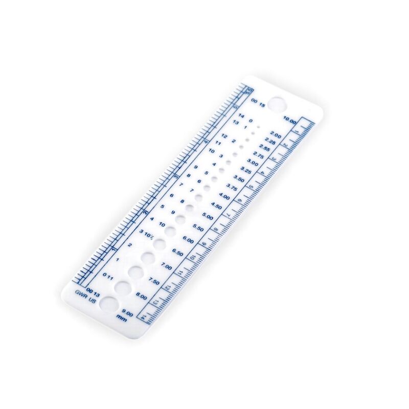 Plăcuţa din material plastic, cu orificii este folosită pentru stabilirea mărimii andrelelor și croșetelor prin încercare: dacă croșeta sau acul de tricotat intră în orificiu și nu rămâne loc între măsurător și ac, înseamnă că acul este de mărimea numărului înscris lângă orificiu. Plăcuța prezintă 18 găuri între 2 și 9mm, cu mărimile exprimate în mm, în sistemul US și în sistemul GWR. Măsurătorul poate fi folosit și ca riglă, pentru că prezintă gradații, pe o latură în cm, pe cealaltă în inch. Dimensiune: 4x16cm. Prețul se referă la o bucată.