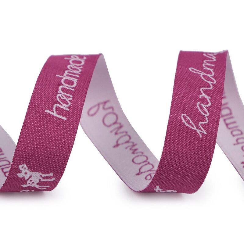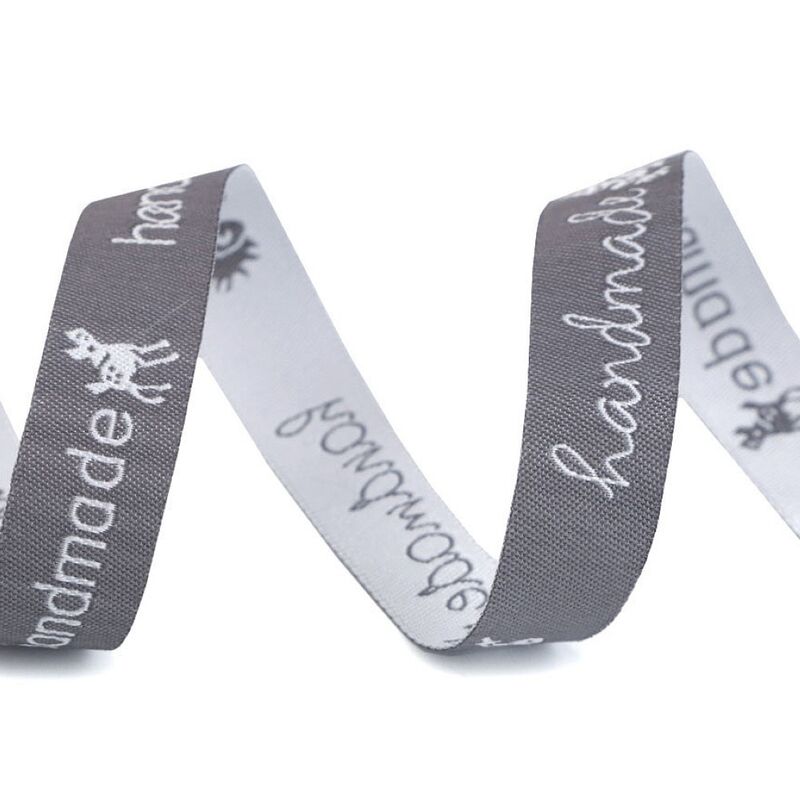 Panglica este decorata cu inscripția „handmade”. Lăţime: 16mm, Material: 100% poliester. Preţul se referă la 3m